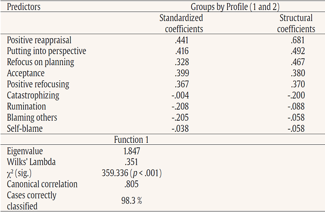Next, we carried out a discriminant analysis, including as predictors the nine dimensions of the CERQ-S and as criterion variable the groups obtained previously by means of the cluster analysis (Table 3). The variables with the best capacity for predicting an individual’s emotional regulation profile are (beginning with the best): positive reappraisal, putting into perspective, and refocus on planning.