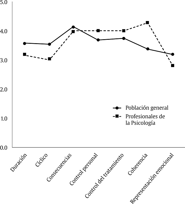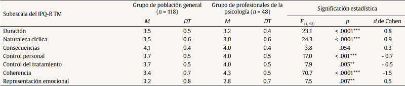 Al comparar la percepción de la muestra de la población general con la del grupo de profesionales de la Psicología se observan diferencias estadísticamente significativas en las puntuaciones de la mayor parte de las subescalas del IPQ-R TM (excepto de la subescala de consecuencias), de forma que los profesionales de la Psicología perciben estos trastornos, de manera estadísticamente significativa, como menos crónicos, menos cíclicos, más controlables mediante la conducta de la persona y del tratamiento, más coherentes o comprensibles y con menos carga emocional negativa que los participantes de la población general.
