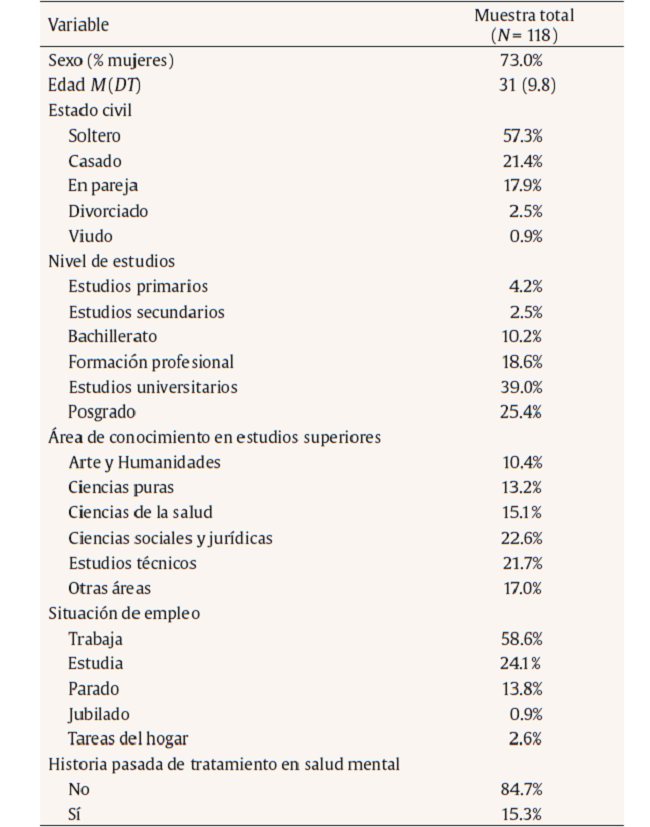 Los participantes de la población general fueron captados a través de correo electrónico, redes y contactos sociales. Como criterio de inclusión se consideró ser mayor de edad y tener un dominio adecuado del castellano. Como criterios de exclusión se consideraron el tener alguna titulación vinculada al ámbito específico de la salud mental (Psicología, Psiquiatría o Enfermería con especialidad en salud mental) y estar diagnosticado actualmente de un problema de salud mental o estar recibiendo tratamiento en la actualidad por este motivo. La muestra final quedó constituida por 118 participantes de la población general, un 73% mujeres (86 mujeres y 32 hombres), con una edad media de 31 años (DT = 9.98, con un rango de 18 a 65 años). Una descripción detallada de la muestra de la población general puede consultarse en la Tabla 1.