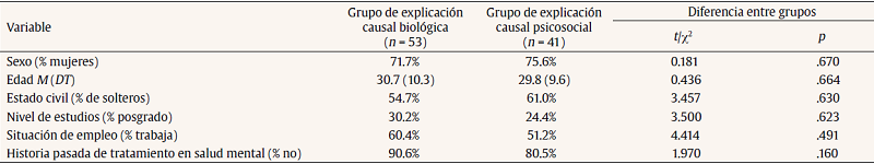 Con el objetivo de comprobar si la explicación causal biológica o psicosocial de los trastornos mentales influye en la percepción que la población general tiene de estos problemas, se dividió a este grupo en dos: aquellos que señalaron entre las dos causas principales de los trastornos mentales alguna variable de tipo biológico (es decir, alteración de los circuitos cerebrales, hereditario, viene de familia, un microbio o virus, trastorno químico cerebral o anomalía cerebral) y aquellos que indicaron exclusivamente variables de tipo psicosocial entre estas dos primeras causas. Del total de los 118 participantes de la población general, 24 no contestaron a esta pregunta. De los 94 participantes restantes, 53 seleccionaron al menos una variable biológica entre estas dos causas y 41 indicaron exclusivamente variables psicosociales, conformando los grupos de comparación.