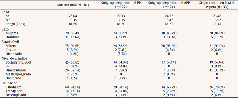 Del grupo control en lista de espera, 6 participantes no fueron incorporados a la muestra por no completar las tres mediciones de la atención y conciencia en el momento presente medido a través de la Escala de atención y conciencia en el momento presente (Mindfulness Attention Awareness Scale, MAAS). Así, el grupo control en lista de espera (n = 33) contó con 28 mujeres y 5 hombres (M = 23.59 y DT = 6.65). Sus características sociodemográficas se encuentran recogidas en la Tabla 1.