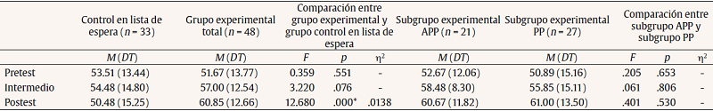 The difference in the means in terms of the attention and awareness of the moment between the PP and APP subjects in the pre-test values was assessed by a Student t-test, t(45.96) = .60, p > .05. A 2 x 2 ANOVA was applied to the intermediate measure, F (1, 46) = 0.061, p > .05, and a 2 x 3 ANOVA with a Huynh Feldt correction was applied to the post-test values, F(1.847, 92) = 0.401, p > .05.
