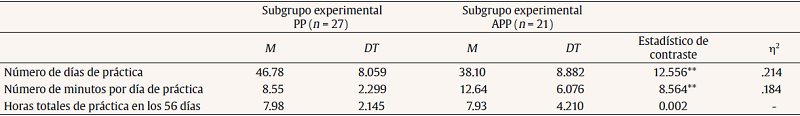 Para el número de días de práctica se cumple el supuesto de igualdad de varianzas analizado mediante la prueba de Levene (F = 0.21, p > .05). Se aplicó una prueba t de Student, obteniendo resultados estadísticamente significativos en el número de días, t(46) = -3.54, p =< .01, 2 = .214). El subgrupo PP practicó más días (M = 46.78 y DT = 8.05) que el subgrupo APP (M = 38.10 y DT = 8.88).
