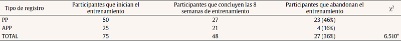 Para analizar la adherencia al entrenamiento, en cuanto al abandono de los participantes en función del tipo de registro, se aplicó la prueba V de Cramer (V = .295, p < .05). Del subgrupo APP abandonó el entrenamiento el 16% y del subgrupo PP el 46%, siendo la proporción de abandonos significativamente menor en el grupo APP (Tabla 4).