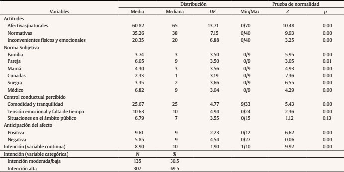 En la Tabla 2 se muestra la descripción de las variables de interés. Se realizaron pruebas de normalidad para determinar la distribución de los datos. Solamente la subescala de situaciones en espacios públicos del CCP mostró una distribución normal. En general, las participantes mostraron actitudes favorables hacia la lactancia (en las dimensiones afectivas/naturales y normativas) y una evaluación heterogénea hacia los inconvenientes físicos y emocionales. La opinión de la pareja, la mamá y el médico fue la que se evaluó como más importante, mientras que las cuñadas y la suegra fueron los familiares que menor importancia recibieron. Las escalas de CCP y de anticipación afectiva muestran que las participantes tienen una alta percepción de facilitadores (comodidad y tranquilidad) y una anticipación del afecto positiva hacia la lactancia y muy baja anticipación negativa.