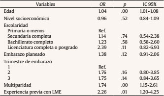 The mean age of the participants was 24 years and 26 weeks of gestation, most reported a socioeconomic level from low to middle medium, 76% were married, most were housewives (69%), 55% were primiparous and in almost half of the cases (49%) it was an unplanned pregnancy. The multiple logistic regression, adjusted to the number of previous children and age, showed moderate associations with intention to EBF: subjective norm (especially in the opinion of the mother of the participant), OR = 1.07 (IC 95% [1.01-1.14]), and perceived behavioural control (perceptions of facilitators for breastfeeding), OR = 1.05 (IC 95% [1.01-1.11]). In the multivariate model attitudes were marginally significant, especially the ones related to affect, OR = 1.0 (IC 95% [1.00-1.03]), and to physical and emotional discomfort, OR = 1.03 (IC 95% [1.00-1.07]).