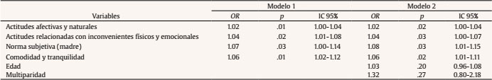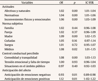 Los mismos análisis bivariados se realizaron con los constructos de la TCP (Tabla 4). Las tres dimensiones de las actitudes se asociaron significativamente con la intención de lactar: actitudes hacia los inconvenientes físicos y emocionales de la lactancia, OR = 1.06 (IC 95% [1.03-1.09]), actitudes normativas, OR = 1.04 (IC 95% [1.0-1.06]), y actitudes afectivas y naturales, OR = 1.02 (IC 95% [1.01-1.04]). De tal modo que, por cada unidad de cambio en las actitudes, la posibilidad de tener una alta intención aumentaba en un 6%, 4% y 2% respectivamente. Al analizar la escala de norma subjetiva por cada referente sólo la opinión de la madre y la opinión del médico se asociaron con la variable resultado, con una OR de 1.09 (IC 95% [1.02-1.15]) y 1.08 (IC 95% [1.01-1.15]) respectivamente, mientras que la posibilidad de presentar una intención alta de lactar aumenta con la percepción de comodidad y tranquilidad en un 8% por unidad de cambio y en un 12% con la anticipación de emociones positivas (Tabla 4).