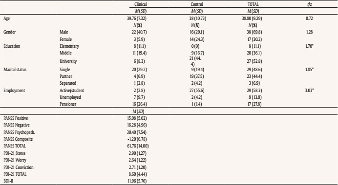 Statistical analyses were performed using SPSS version 25.0. Mean and standard deviation were used to evaluate descriptive data. Differences between the means of the two groups were evaluated through Student’s t-test for two independent samples and Cohen’s d to calculate the effect size. Bivariate correlations were used to observe relationships between attributional styles, clinical variables, and SF within the clinical group. Multiple linear regressions with stepwise method were conducted to check possible predictors of clinical variables. The criterion was: probability of F to enter ≤ .05; probability of F to eliminate ≥ .10. Psychotic symptoms (PANSS scores) and delusion severity (PDI-21scores) were considered as dependent variables. Age and gender were forced to enter in the first step as possible confounding variables. In the second step, BDI-II and ASQ scores were introduced. In the case of Depression (BDI-II), same method was used in the first step. In the second step, PANSS scores were introduced. In the last step, ASQ scores were introduced. Finally, multiple linear regressions with the same stepwise method were conducted to check possible predictors of SF areas controlling for BDI-II (weighted least squares regression). To avoid possible collinearity between variables, only ASQ composite indexes were included as possible predictors in the last step.