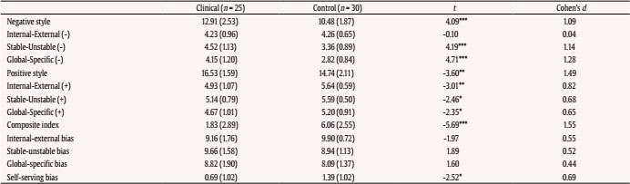 Statistically significant differences were found between both groups for most attributional styles with moderate to large effect sizes (Cohen’s d). Table 2 shows differences between groups in attributional styles. The clinical group was significantly more “pessimistic” ( t = -5.69, p < .001).