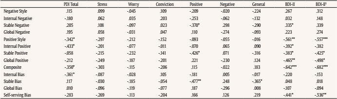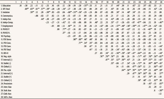 A stable attribution for negative events and an external, unstable, and specific attribution for positive events correlated with depression (BDI-II). A self-serving bias also correlated (inversely) with depression. A general “pessimistic” trend, measured by the ASQ positive-negative composite index, highly correlated with depression ( r = -.642, p < .001). Correlations are shown in Table 3a. To demonstrate that relations between attributional styles and depression were not influenced by psychotic symptoms, partial correlations were calculated controlling by positive, negative, and general symptoms. Correlations remained significant (see Table 3a).