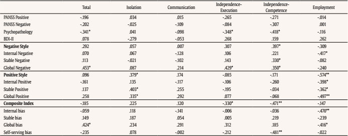 A stable and global attribution for positive events correlated to educational level. The employment status was related to an internal, stable, and global attribution for positive events, and with an internal attribution for negative events. Employment was also related with general SF. A higher educational level and a better employment situation correlated with a lower social isolation. The full correlation matrix is shown in Table 4.