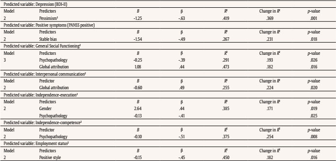 Regarding SF, after weighting for depression, PANSS general psychopathology predicted a worse general SF and a global attribution style predicted a better one, F(4, 20) = 4.49, p = .009. A global attribution predicted better interpersonal communication, F(3, 21) = 2.40, p = .09. General psychopathology predicted a worse independence-execution, F(3, 21) = 4.39, p = .015, and a worse independence-competence, F(3, 21) = 4.19, p = .018. A positive attribution style predicted a better employment status, F (3, 21) = 5.72, p = .005. No model predicted adequately social isolation. Table 5 summarises all regression models that were predictive.