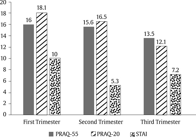 Average PRAQ-55 scores for each trimester of pregnancy were 122.48 (SD = 41.71), 117.59 (SD = 44.02), and 116.96 (SD = 43.95), respectively. Concerning the PRAQ-20, average scores were 50.66 (SD = 16.76) in first trimester, 47.37 (SD = 17.93) in second trimester, and 44.68 (SD = 18.02) in third trimester. Finally, average STAI scores were 16.96 (SD = 10.25), 14.29 (SD = 9.02), and 15.94 (SD = 9.87), respectively.