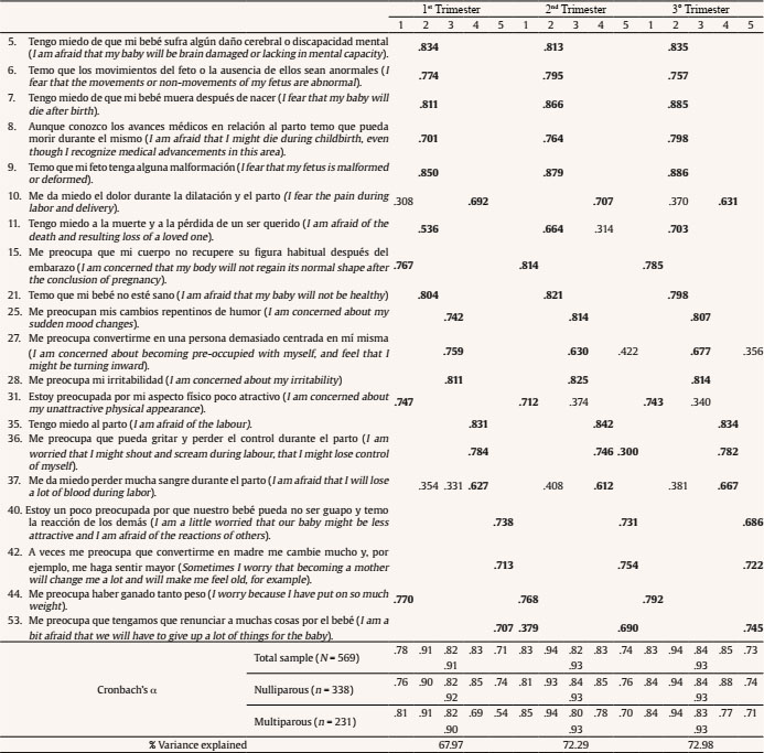 EFA results for this scale support a model consisting of five factors: factor 1, “concern for changes in oneself”, is made up of items 15, 31, 44; factor 2, “fear for the baby’s integrity”, composed of items 5, 6, 7, 8, 9, 11, 21; factor 3, “feelings about oneself” composed of items 25, 27, 28; factor 4 “fear of childbirth”, made up of items 10, 35, 36, 37; factor 5, “concern about the future”, composed of items 40, 42, 53. The same model is obtained in each trimester of pregnancy with a variance explained of 67.97%, 72.29%, and 72.98%, respectively (Table 1).