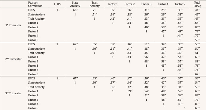 Table 2 summarizes PRAQ-20 concurrent validity, which was evaluated by correlating PRAQ measures with STAI and EPDS in first-, second-, and third trimester. Correlation between EPDS, state-STAI, and trait-STAI with both total PRAQ and each of the factors ranged from .25 to .47 in first trimester, from .30 to .53 in second- and from .34 to .56 in third trimester, respectively. On the other hand, correlation of different factors among themselves, as well as with the total PRAQ ranged from .29 to .85 in first trimester, from .35 to .88 in second- and from .34 to .88 in third trimester, respectively.