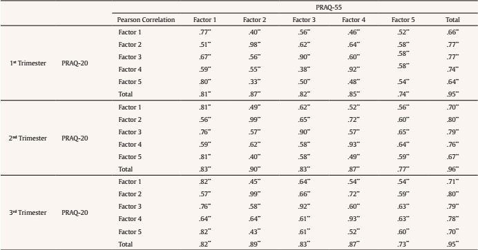 On the other hand, Table 3 summarizes the correlation of PRAQ-20 with PRAQ-55 in first-, second-, and third trimester. Correlation between PRAQ-20 and both total PRAQ-55 and each of the factors ranged from .33 to .98 in first trimester, from .40 to .99 in second-, and from .43 to .99 in third trimester, respectively.