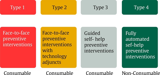 Note that because Type 4 interventions do not require human support, they are non-consumable. Unlike the other three types, which are limited by the number of providers available, Type 4 interventions can be used repeatedly by an unlimited number of people anytime, anywhere, without losing their therapeutic or preventive power. The marginal cost of Type 4 interventions (the cost of providing the intervention to one more person) eventually approaches, though it never reaches, zero: a website that costs one million dollars to build and test would cost $1000 per person if 1000 people use it, $1 per person if one million people use it, and ten cents per person if ten million people use it.