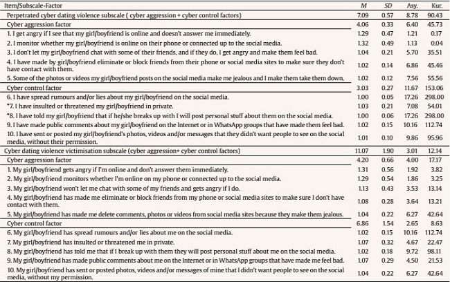 However, in this studyby thisby , two items from the cyber aggression factor of the ‘Perpetrated cyber dating violenc’e subscales had to be removed, as their loadings were close to 0. In other words, very few participants (almost none) responded affirmatively to these items. The social desirability bias is likely to play an important role in this issue, prompting people not to acknowledge that they engage in this type of behaviour towards their partner. Indeed, overall, studies have reported a negative relationship between social desirability and intimate partner violence scores, and research has shown that violence perpetration reports appear to be more prone to the influence of social desirability than reports of victimisation (Bell & Naugle, 2007; Sugarman & Hotaling, 1997). Although it may seem that eliminating these items from only one subscale and not from its analogue would affect content validity, the truth is that the perpetrated cyber dating violence and cyber dating violence victimisation subscales are independent constructs, even though they constitute two parts of the same questionnaire (as reflected in the SEM model). Moreover, in the construction of the questionnaire, the original authors did not intend to enable an item-by-item comparison using the test, suggesting that it is not strictly necessary for the items in the ‘Perpetrated cyber dating violence’ and ‘Cyber dating violence victimisation’ subscales to be totally equivalent. Nevertheless, future validation studies should continue to analyse the role of these two items in the test, and if necessary, reformulate or eliminate them definitively.