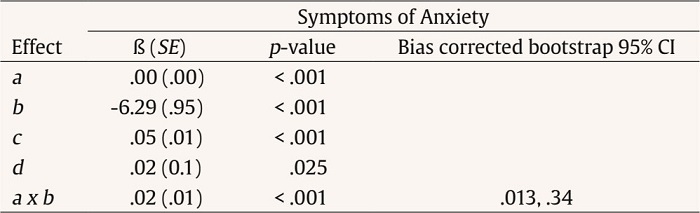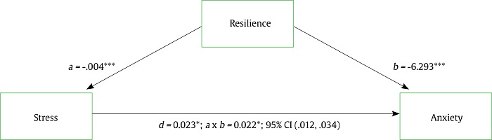 There was a significant indirect effect of stress on symptoms of anxiety through resilience (β = -6.29, p < .001, 95% CI [.16, .10]). Resilience partially mediated the relationship between stress and anxiety symptoms (β = .02, p < .001, 95% CI [.34, .13]) as: (i) the direct effect was smaller than the total effect of stress on symptoms of anxiety and (ii) there was no zero in the 95% bias-corrected bootstrap confidence interval for the indirect effect.