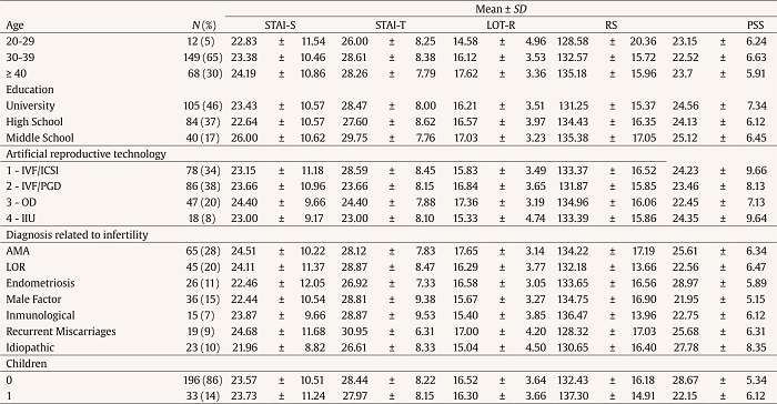 Women in this sample had an age ranging from 18 to 45 years (M = 36.83 years, SD = 0.26), with a history of infertility ranging from 6 to 60 months (M = 19.82, SD = 0.89). Participants in this sample had a range of diagnosis associated with infertility. In this respect, an amount of 65 women (28.38%) was diagnosed of advanced maternal age (> 40 years old), n = 45 women (19.21%) had a low ovarian reserve, n = 26 (11.79%) endometriosis, n = 15 (6.99%) suffered from an immunological disease (Hashimoto’s disease, rheumatoid arthritis, antiphospholipid syndrome), n = 19 (8.30%) had recurrent miscarriages, n = 36 (15.72%) had a male factor, and n = 23 (9.61%) were diagnosed from idiopathic infertility. Participants’ clinical characteristics are presented in Table 1, including levels of resilience and optimism depending on the level of education.