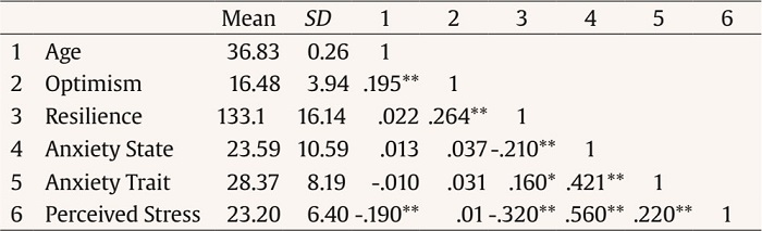 Correlation analysis between the psychological measures showed that state and trait anxiety were significantly associated with optimism (r = .037, p = .05, and r = .031, p = .05, respectively). Our results indicated a significant negative correlation between perceived stress and resilience (r = -.320, p = .001). Perceived stress was significantly associated with state and trait anxiety (r = .560, p = .001 and r = .220, p = .001). Resilience was significantly and negatively correlated with state anxiety (r = -.210, p = .001) and moderately (positive or negative) associated with trait anxiety (r = .160, p = .05). Table 2 presents mean values, standard deviations and Pearson’s correlations between age and the psychological measures (LOT-R, RS, STAI-S, STAI-T, PSS).