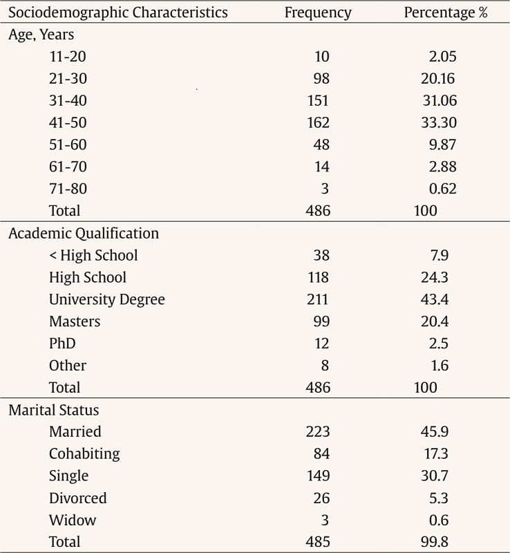 The study sample consisted of 486 participants with a history of episodic or chronic migraines, recruited between March and July 2021 through MiGRA Portugal and social media support groups for people who suffer from the disease. Therefore, it is a convenience sample. Of these, 460 (94.7%) participants were female and the remainder 26 were male (5.3%), reflecting the global tendency of this disorder that suggests that women are more affected than men – gender ratio 3:1 (Barros, 2005; Lipton, Bigal, et al., 2003; Murray & Lopez, 1996). Furthermore, mean age was 39.4 years (SD = 10.9), and the most common academic qualification was university degree (43.4%). Regarding marital status and household composition, 45.9% of participants reported being married and 60.1% mentioned having children. Table 1 details participants’ sociodemographic characteristics.