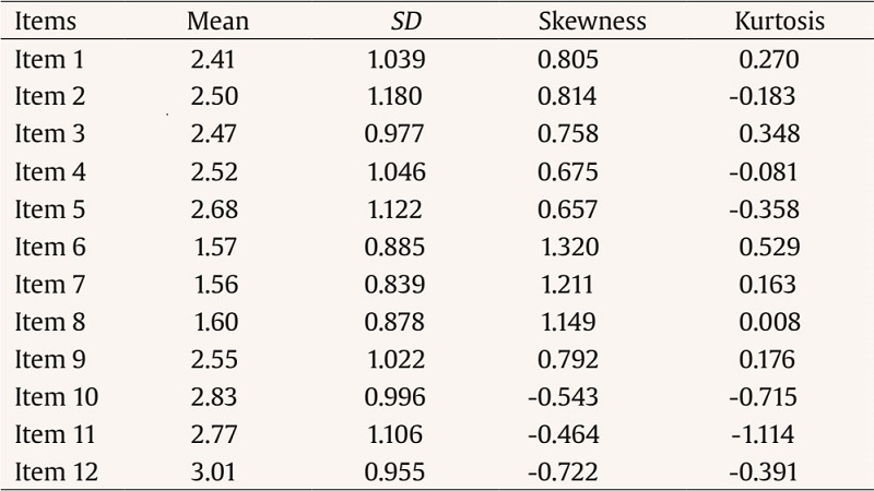 The values of skewness and kurtosis were considered to assess the items’ sensitivity, which should be < [3] and < [8], respectively (Marôco, 2010). According to Table 2, the normal distribution is assured since all 12 items present acceptable values regarding skewness and kurtosis. Therefore, it is possible to evaluate the factor structure of this instrument through exploratory factor analysis.