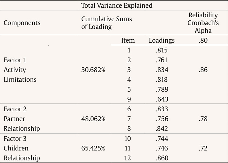The exploratory factor analysis proceeded using principal component analysis with varimax rotation in a random subsample obtained from randomly dividing the original sample in two. It was possible to observe, through total variance explained that there are three underlying factors whose eigenvalue is at least 1 (Table 3) and therefore explain the 12 items of the instrument. Further and as observed in Table 3, the cumulative sums of squared loadings indicate that these three factors explain 65.42% of the total variance, above the minimum score (65.42% > 50%). The communalities were observed to understand the proportion of variance accounted for by selected components. The items explain 54.1% to 71.1% of the construct’s variance before the rotated component matrix. Finally, the rotated component matrix was carried out using varimax rotation with Kaiser normalization and principal component analysis extraction method. The output in Table 3 demonstrates that the first component or factor is constituted by 6 items, the second ranges from item 6 to 8, and, finally, the third factor or component is measured by items 10 to 12. These three components correspond to Activities, Partner Interactions, and Children Interactions factors, respectively. The scale – .80 – and each factor’s internal consistency were evaluated using Cronbach’s alpha and are presented in Table 3. As evidenced, this measure’s internal consistency and its factors are good, ranging from .72 to .86 (Table 3).