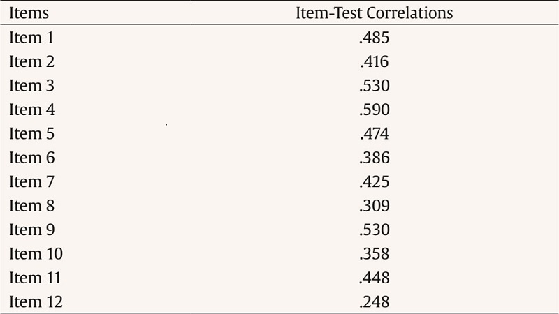 Furthermore, the discrimination index was assessed to evaluate the item-test correlations for each item. Table 4 shows that all items, except the last one, present correlations above .30, ranging from .25 to .59. Thus, these values indicate good discrimination properties among individuals suffering from migraines.