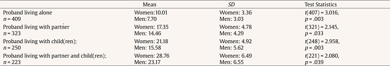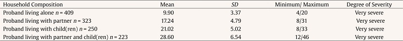 Additional analyses were conducted regarding the full scale and its three factors, according to its scoring system and other sociodemographic variables, such as sex, age group, and marital status. Firstly, the experienced impact was assessed regarding each household composition and considering the scoring system proposed by Lipton et al., 2017. Of this analysis resulted that all the subgroups (e.g., probands living alone, with partner only, with child[ren] only, with partner, and child[ren]) presented, in average, a very severe impact, as illustrated in Table 5. Further and more detailed analyses were conducted to better understand these results.