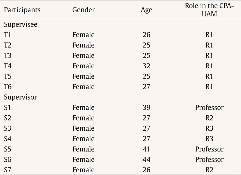 Six novice CBT therapists (supervisees), in their first year of residency (R1) at the CPA-UAM and seven supervisors, teachers of the Faculty of Psychology or therapists at the CPA-UAM with more clinical experience than the R1s, participated. Recordings of forty supervision sessions and 80 therapy sessions (the two sessions that followed each supervision session) were collected, which ranged in length from 12 min to 1 hour and 11 min (M = 35.4 min); 31 clients of the CPA-UAM, both adults and children, with different diagnoses participated in the study. The training program consisted of a three-year residency. Between four and six novice therapists enter the first year of residency (R1), and only two of them continue as second (R2), and third-year (R3) residents. Residents participate in periodic supervision sessions, with R1s receiving 8 hours per week. Table 1 includes some characteristics of the supervisors and supervisees.