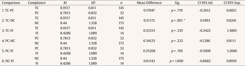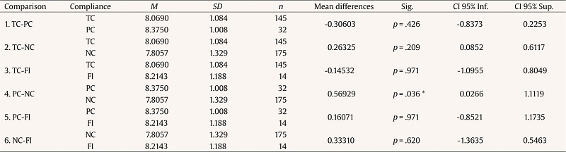 Homoscedasticity could not be assumed, F(3, 362) = 3.288 (p = .021). A significant difference was found between at least two compliance groups F(3, 49.763) = 2.977 (p = .04, est. ω2 = .016), with a small effect size. Post hoc comparisons, performed using the Games-Howell test, showed that the guidelines rated “partial compliance” received a significantly higher score in confidence with the supervision provided by supervisors than guidelines rated “non-compliance”, the mean difference being .57 (p < .036, CI 95% [0.26, 1.11). Table 3 shows the confidence means in the compliance groups, the pairwise comparisons and the significance of their differences.