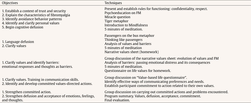 The intervention was applied in a group ACT treatment program in five weekly two-hour sessions. The therapeutic objectives of the sessions focused on psychological acceptance and cognitive defusion, values and the behaviors involved in those values. The treatment was applied in the IG divided into three smaller groups of eight, eight and nine participants. Table 1 shows the order of the sessions and the techniques used.