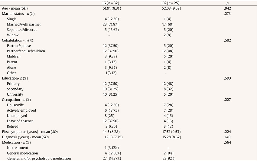 The sociodemographic characteristics of the participants in the IG and the CG are shown in Table 2, where statistically significant differences between the sociodemographic variables in the two groups may be observed. As no between-group differences were found in age, marital status, education, occupation, time since the appearance of the first symptoms, or type of medical treatment prescribed, the two groups of participants were homogeneous with respect to those variables.