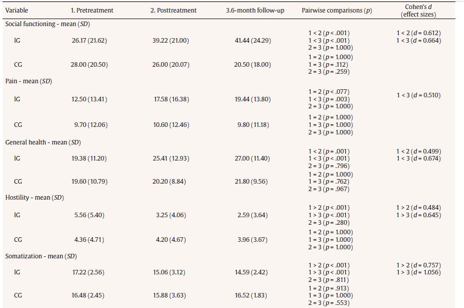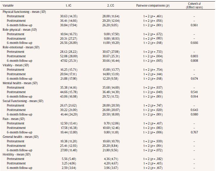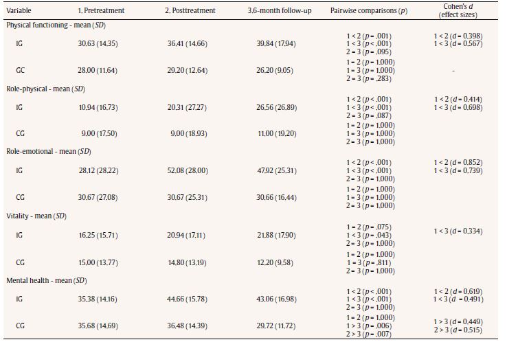 Table 4 presents the results of the intragroup comparison for IG and CG at pretreatment, posttreatment, and follow-up (six months). It may be observed that there were statistically significant improvements in the IG from pretreatment to posttreatment and from posttreatment to follow-up on the SF-36 Health Survey Questionnaire physical functioning, role-physical, role-emotional, mental health, social functioning, and general health subscales. On the vitality and pain subscales, differences between pretreatment and follow-up were statistically significant. The results show improvement in vitality and severe pain. However, in the CG, mental health fell significantly from pretreatment to follow-up and from posttreatment to follow-up.