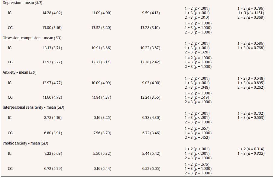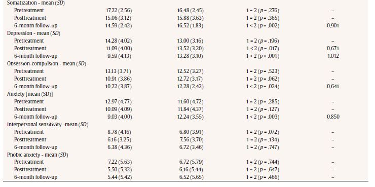 The results of the SA-45 Symptom Assessment-45 Questionnaire showed statistically significant differences in means on depression both at posttreatment and at the six-month follow-up. The between-group differences on somatization, obsession-compulsion, and anxiety scales were significant at the six-month follow-up. In all cases, IG scores were lower than CG scores. There were no differences at the end of treatment nor at the follow-up on psychoticism, paranoid ideation, phobic anxiety, nor interpersonal sensitivity subscales.