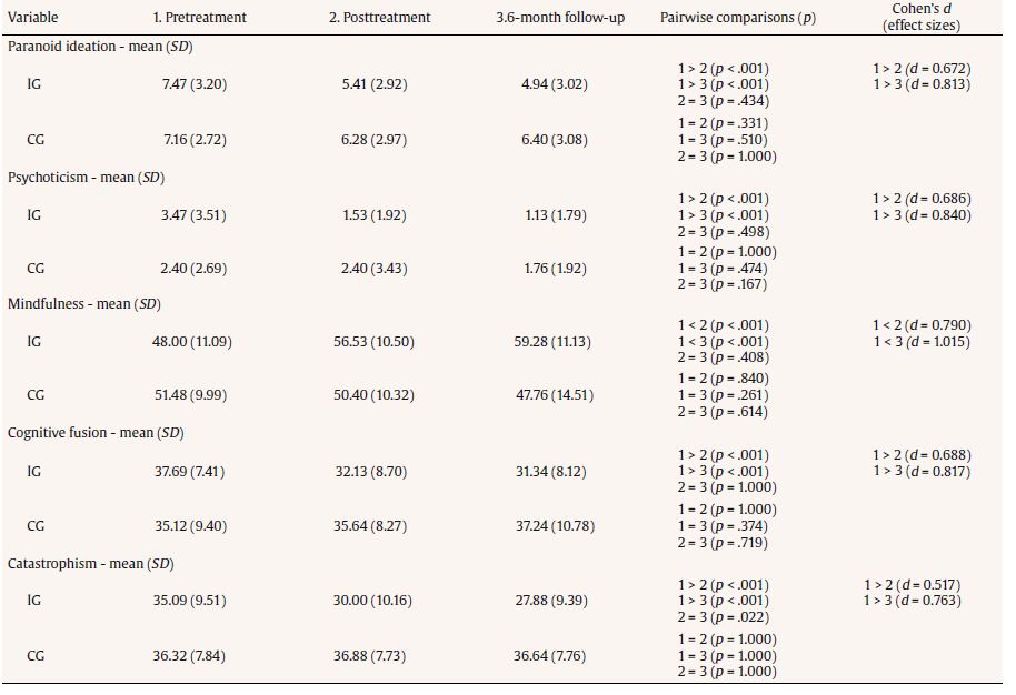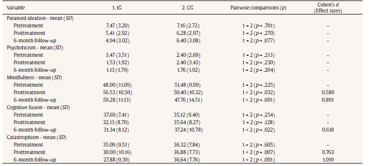 Scores on the variables in the SA-45 dropped statistically significantly on hostility somatization, depression, obsession-compulsion, anxiety, interpersonal sensitivity, phobic anxiety, paranoid ideation, and psychoticism subscales. Furthermore, scores rose significantly in mindfulness, and were lower in catastrophizing and in cognitive fusion between pretreatment and follow-up.
