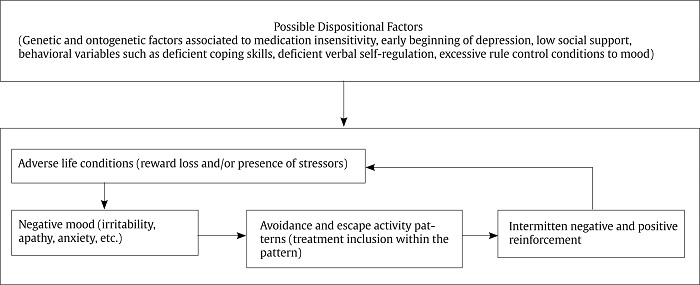In summary, (a) life changes understood as a decrease in contingent reinforcement of regular activities, the loss of opportunities to engage in pleasant activities, the sudden increase in stressors or unwanted effects contingent to the individual’s habits, and possible deficits in coping skills when faced with adversity would result in (b) a decrease in behaviors oriented to positive reinforcement and an increase in avoidance and escape behaviors from the stressful or deprivation experience generated by the conditions previously described. (c) Both, the reinforcement of this avoidance and escape behaviors and a possible rule following of the type “I must feel good before I can change my habits or solve my problems”, and possible difficulties to organize behaviors in persistent activity patterns in the face of adversity, result in (d) the establishing of a lifestyle oriented to the avoidance of psychological distress that results in more reward loss and the surging of bigger stressors, in an abulic and anxious mood, in hopelessness cognitions, an external locus of control, low self-efficacy, low self-esteem, and hypoactivity in reward circuits, characteristics of depression. Eventually, intermittent reinforcement of avoidance and escape behaviors (and their eventual positive reinforcement), the use of medication or psychotherapy with the same avoidant goals, and the deterioration (due to disuse) of coping skills oriented to reward, problem-solving, and subsequent efficacy feeling included in pleasant activity patterns would generate a chronic depressive cycle resistant to treatment. Theoretically, dispositional factors such as disorders in the secondary neuroendocrine functional systems, non-genetic variants, weak support systems, early-onset depressive cycles with the presence of other affective symptoms, pre-existing interpersonal behavior disorders, or substance abuse are associated with the persistence of these depressive loops and its resistance to otherwise effective depression treatments. See Figure 1 for a synthetic representation of this theory.