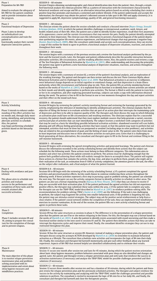 - Based on the explanatory model of TRD, a protocol of six phases and thirteen sessions has been developed for the approach of TRD. This protocol, which is presented in this paper, can be easily trained by therapists who are familiar with BA. Although it still requires more empirical work, its solid learning foundations and its link with previously successful BA interventions bode well for its usefulness to clinicians.