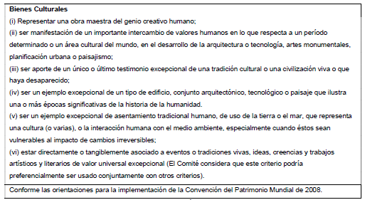 Según Ribeiro & Zanirato (2006) ya en 1977 la UNESCO contribuyó en los procesos de identificación patrimonial a nivel mundial al definir los criterios para caracterizar los bienes y áreas como “Patrimonio Cultural y Natural de la Humanidad”. Dichos criterios son los que definen el valor universal y excepcional del bien, su autenticidad y originalidad, imponiendo al Estado sede la obligación de adoptar medidas protectoras adecuadas a la naturaleza de ese bien objeto de inscripción. Según Araújo (2013) dichos criterios serían los siguientes (Cuadro 1).