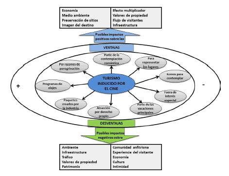Desde un punto de vista amplio el turismo inducido por el cine ha sido esquematizado en la Figura 1. Las cuestiones a favor y en contra del concepto deben tratarse de manera que se muestren las limitaciones de los nuevos destinos turísticos.