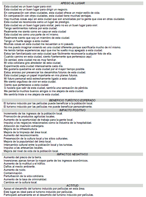 La segunda sección del cuestionario buscó reunir información sobre las actitudes de la población local hacia el desarrollo del turismo inducido por películas. Los ítems estaban relacionados con los conceptos de cognición, afecto y acción, que se diseñaron basados en la revisión de la literatura (Gifford, 2007; Perdue et al., 1990).