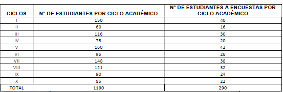 Al reemplazar los valores en la fórmula se obtuvo una muestra de 285 estudiantes. Se usó un muestreo estratificado de afijación proporcional para determinar el número de estudiantes a encuestar por ciclo (se presentaron casos en las que se obtuvieron cifras impares, por tanto, éstas fueron convertidas a pares para poder encuestar a una mitad por la mañana y a otra por la noche, con excepción de noveno y décimo ciclo ya que los cursos que se dictan en estos ciclos normalmente son en el turno noche. Debido a esta operación en el cambio de cifras se obtuvo una muestra total de 290 encuestados (Tabla 1) y, posteriormente, se usó el muestreo aleatorio simple para seleccionar las aulas y a los estudiantes por ciclo. Finalmente los datos fueron procesados en el programa estadístico SPSS versión 22.