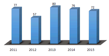 La distribución anual de las tesis entre 2011 y 2015 (Figura 1) mostró un aumento de la producción en aproximadamente el 16% en relación al período anterior (Rejowski, 2013). En todos los años del período la producción fue irregular y osciló entre 57 y 80, con una media anual de 70,6 tesis, aunque con una leve disminución de 2013 a 2015 fue superior a la media del período anterior (33 tesis por año).