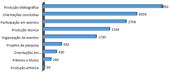 La extracción de los datos de los 356 doctores recién recibidos mediante el scriptLattes resultó en un conjunto de informes de la producción académica en ítems separados por tipo de producción con su respectivo gráfico de barras y listado de los ítems en orden cronológico invertido. Considerando la producción académica sólo en el período de 2011 a 2016, se sumó un total de 14.885 ítems distribuidos en orden decreciente (Figura 3).