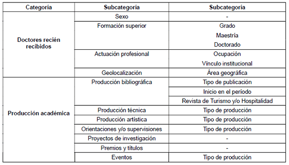 En el Cuadro 1 se relacionan las dos categorías de análisis (doctor recién recibido y producción académica) y sus respectivas subcategorías, que dirigen el tratamiento de los datos recolectados.