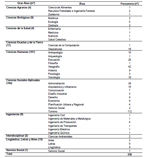 Por los datos de esta tabla, la mayoría de los doctores que eligieron el turismo directa o indirectamente en sus tesis, actuaban en el área de turismo (31%), geografía (12%) o administración (11%), confirmando el hecho de que los investigadores turísticos se insertan principalmente en las ciencias sociales y las ciencias humanas (Jafari & Aaser, 1988; Rejowski, 2010). Otras grandes áreas de actuación de los doctores son la ecología en las ciencias biológicas, las geociencias en las ciencias exactas y de la tierra, la ingeniería de la producción en Ingeniería, y la lingüística y letras en la lingüística, letras y artes.