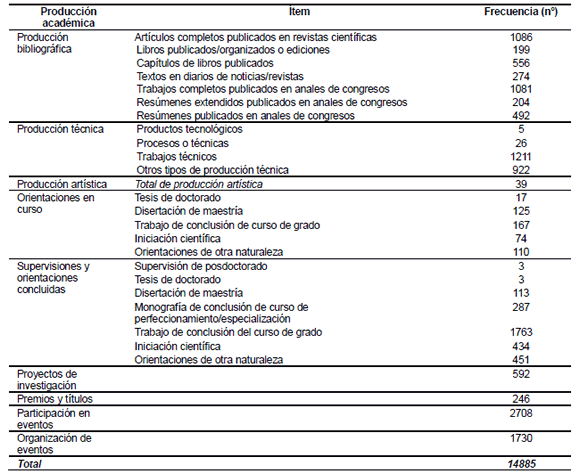 Se observó que la creación en ese período se concentró en la producción bibliográfica, las orientaciones concluidas y la participación en eventos, explicada tanto por los criterios evaluativos de la CAPES que priorizan las publicaciones científicas, en especial los artículos y las presentaciones de trabajos en eventos científicos. Si bien las orientaciones concluidas y en curso tienen mayor expresión en la graduación, se observó una actuación expresiva de los doctores recién recibidos en la orientación de disertaciones de maestría y monografías de cursos de posgrado a nivel de especialización. En la producción técnica se destacaron los trabajos técnicos y otros tipos, seguidos por la organización de eventos, proyectos de investigación, premios y títulos, orientaciones en curso y producción artística (Tabla 2).