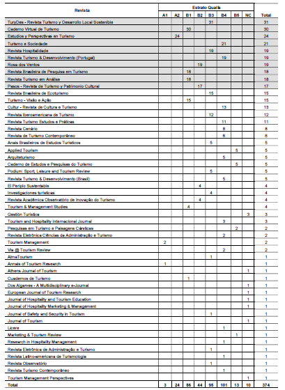 Se observó que las tres revistas iberoamericanas integrantes de las bases SciELO están presentes en la producción de los doctores recién recibidos titulados en Brasil en el siguiente orden: Estudios y Perspectivas en Turismo, Revista Brasileira de Pesquisa em Turismo y Tourism & Management Studies. También las revistas destacadas por Picazo-Peral & Moreno-Gil (2012) están presentes en esa producción, de las cuales se destaca Estudios y Perspectivas en Turismo. Se reafirma entonces lo dispuesto por García (2016) en cuanto al posicionamiento e influencia de esta revista en América Latina con una significativa contribución de investigadores brasileños, y se da fe del reconocimiento brasileño como la revista latinoamericana mejor calificada en el área conforme su clasificación en la lista Qualis (estrato A2).