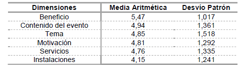 Así, se buscó analizar primeramente las dimensiones que forman parte de la construcción de la imagen de un evento. Pudiendo a través de este análisis identificar las dimensiones que más interfieren en la imagen (Tabla 1).